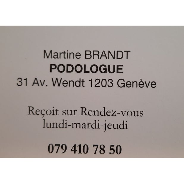 Madame Martine Brandt, est membre de la Société Suisse des Podologues depuis 40ans. Son expérience du soin du pied est très recommandé. Elle vous accueillera dans son cabinet et peux aussi se déplacer à votre domicile. Que vous vous trouviez à Thonex, au centre ville de Genève ou au Grand-Saconnex elle se déplace dans tout le Canton de Genève.